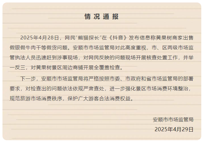2025年4月28日,网民“熊猫探长”在《抖音》发布信息称黄果树商家出售假银假牛肉干等假货问题。安顺市市场监管局对此高度重视,市、区两级市场监管执法人员迅速赶到涉事现场,对网民反映的问题现场开展核查处置工作,并举一反三,对黄果树景区周边商铺开展全覆盖检查。